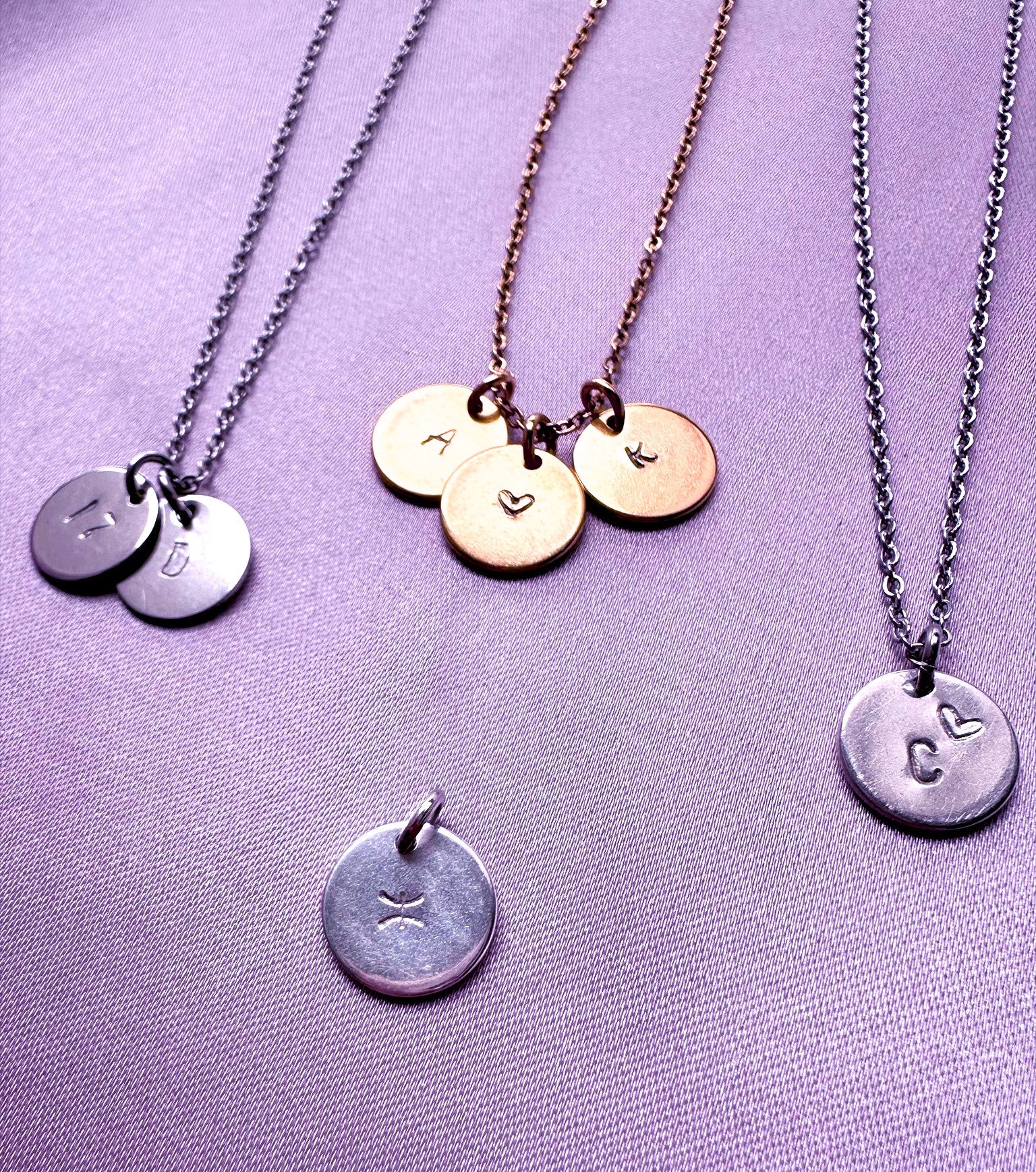 Petits médaillons de 12mm estampillés d’une initiale ou d’un symbole pour créer le cadeau original. Un collier intemporel à porter au quotidien.